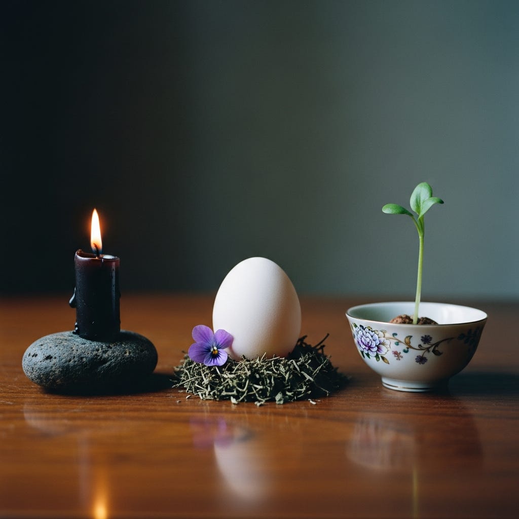 I mitten, placera något som representerar själva balansen. Ett ägg – den äldsta symbolen för Ostara, som representerar helhet, potential och föreningen av motsatser (den gyllene gulan och vitan, solen och månen, i ett enda förseglat kärl). En spegel. En bit klar kvarts, som håller och överför alla frekvenser lika. Om du inte har en altarplats kan detta placeras på en fönsterbräda, ett nattduksbord eller hörnet av din köksbänk.